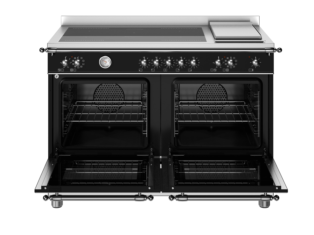Introducing the Bertazzoni HER125I2ENET Heritage Series 120cm Wide Range Cooker—where timeless style meets cutting-edge performance. Designed for passionate home cooks, this induction model features five responsive cooking zones and two spacious 69L multifunction electric ovens, offering exceptional versatility. The elegant finish, solid metal handles, and enamelled oven interiors bring sophistication and durability to your kitchen. Practical highlights include rapid heat-up, precise temperature control, anti-slam soft-close doors, and an A energy rating for efficient operation. A cool-touch worktop and built-in storage drawer add further convenience, making the HER125I2ENET the perfect blend of heritage design and modern innovation.