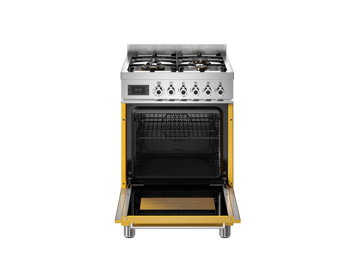 The Bertazzoni PRO64L1EGIT2 60cm Professional Series Range Cooker is a compact yet powerful dual-fuel appliance, ideal for smaller spaces or replacing existing units. It features a 69L electric multifunction oven with 11 versatile cooking functions, including fast preheat and a dedicated pizza mode. The four-burner brass gas hob includes a dual-ring power burner, providing precise control from gentle simmering to high-heat cooking. With an A energy efficiency rating, heavy-duty cast iron pan supports, gas safety valves, and triple-glazed oven doors, this cooker ensures both performance and safety. Finished in a striking yellow, it brings professional-grade functionality and distinctive style to any kitchen.