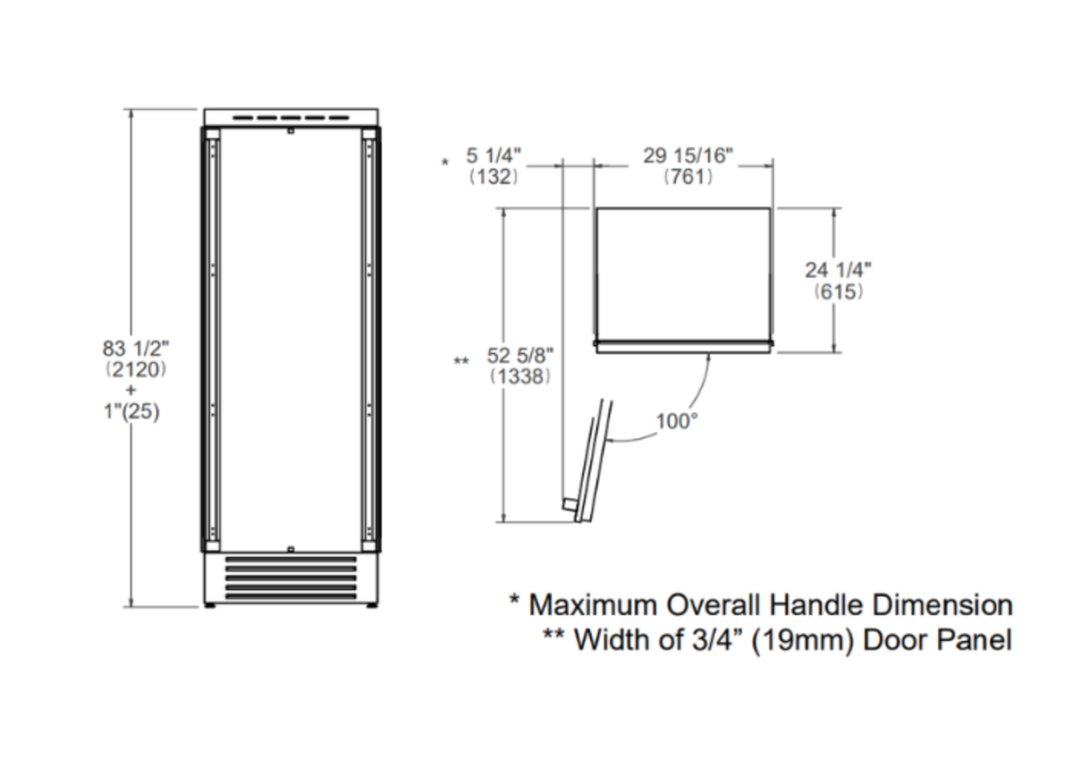 Proprietary lift & swing hinges allow for flush installation with minimal clearance from surrounding cabinet panels. This allows for elegant configurations of refrigerator, freezer and wine cellar in any desired width.