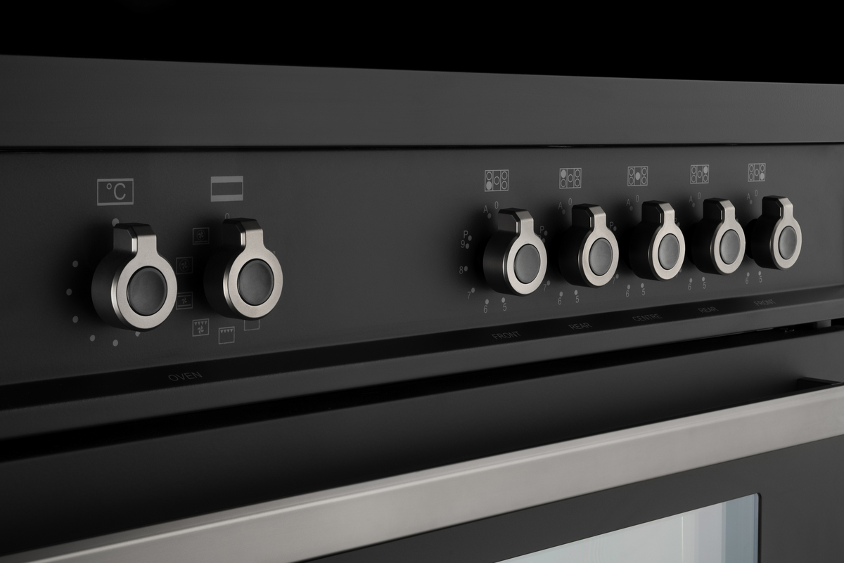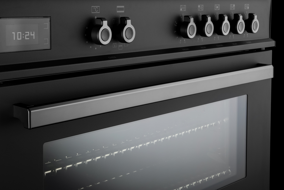 The double-oven range cooker gives great versatility and style to your kitchen. The main oven electric oven has 11 functions, from convection, baking and grilling to warming and features a digital programmer that allows a perfect control of cooking. It displays the oven functions selected, manages time during cooking and gives feedback on real-time temperature. The useful auxiliary oven has six modes. Triple-glass doors minimise heat loss. The hob has an induction top with five heating zones, including booster feature, pot detection, residual heat indicator for each zone and two flex zones.