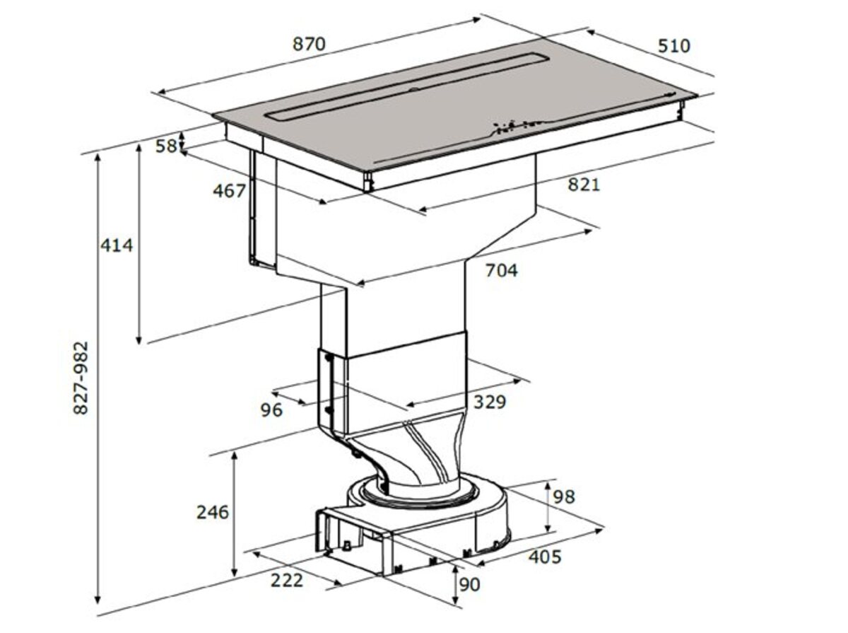 The integrated hood, available in suction or filtering mode, has 6 speed selections and automatic control and is 100% safe against water leaks. The aluminum filters can be regenerated in the oven for long-lasting use. A+++ Energy rating.