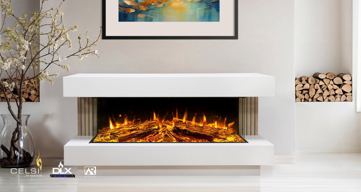 DLX MIDNIGHT EDITION The Midnight Edition is a visual triumph and an exclusive standard feature on every DLX 3-Sided Media Wall Fire, marking the ultimate evolution in electric fireplace realism. Engineered using specialised rear screen dark glass, this premium feature maximises contrast, intensifying the dynamic flame visuals and making our signature fuel bed more vibrant than ever before. The result is a truly immersive viewing experience that anchors your media wall with unmatched sophistication and depth.