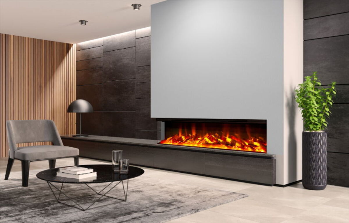 CELSI SMART Electriflame Virtual Reality fires. Electriflame VR Commodus S1600 is a 3 sided glass Smart fire offering the perfect slimline built-in solution for your feature wall.