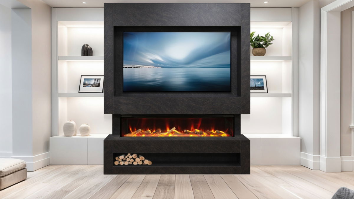 Our pre-built media wall suite is crafted in the UK using premium-grade Egger board finished with Cupria Slate, elegant warm tones of black and copper, its light texture feels natural and looks sophisticated. The media wall suite comes in three easy-to-assemble parts, making installation simple. Our design incorporates a log storage compartment, and a TV recessed compartment with a cut-out rear panel to flush-mount your TV.