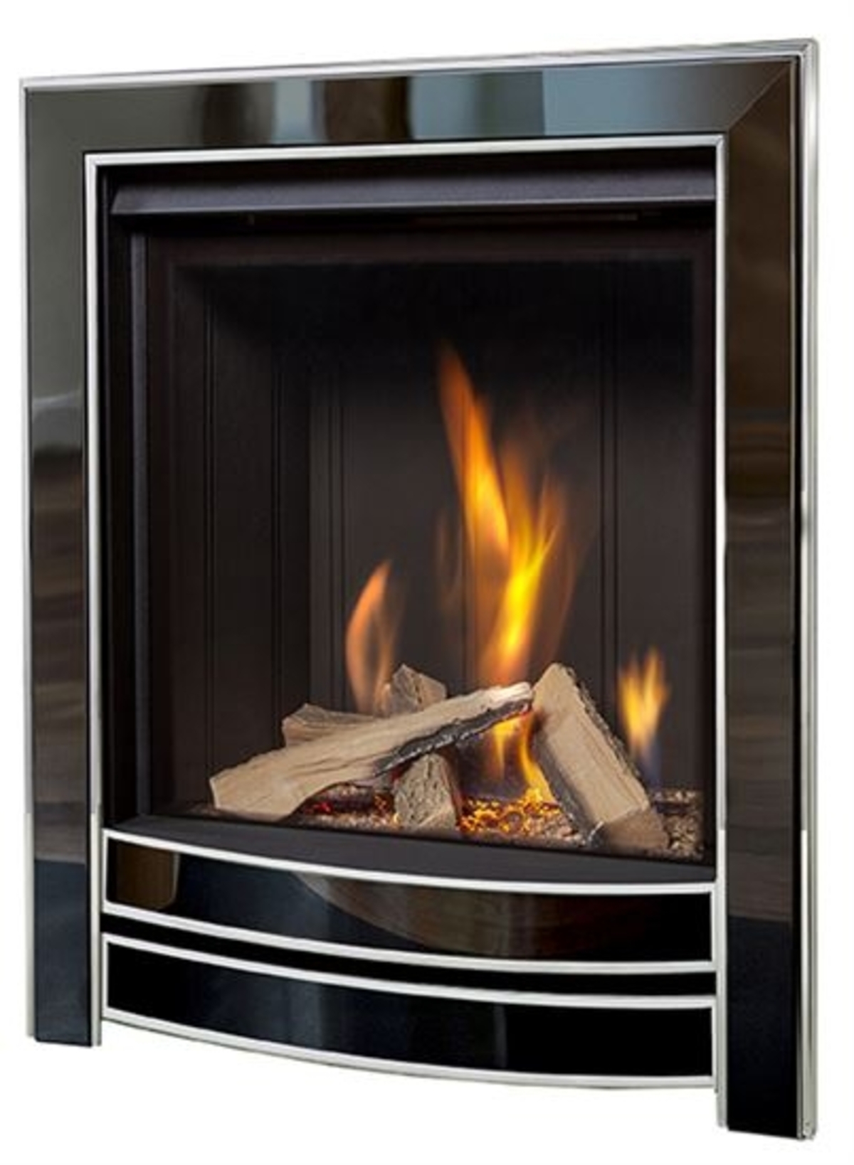 Romance is an exceptionally stylish and impressive natural log fuel effect gas fire. This glass fronted fire is operated by remote control, delivering an exceptional heat output of 4.0kW, with a high efficiency rating of 82.6%. The Romance is designed with a large clear glass window to provide wide-angle views of the lively full depth log burning fuel effect. This stunning gas fire is further complemented with a uniquely designed Black Nickel & Chrome fascia.