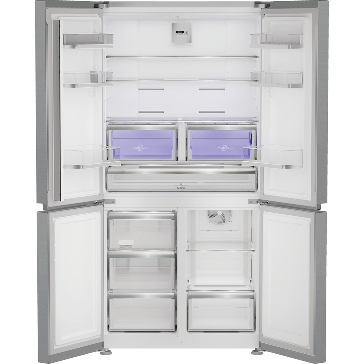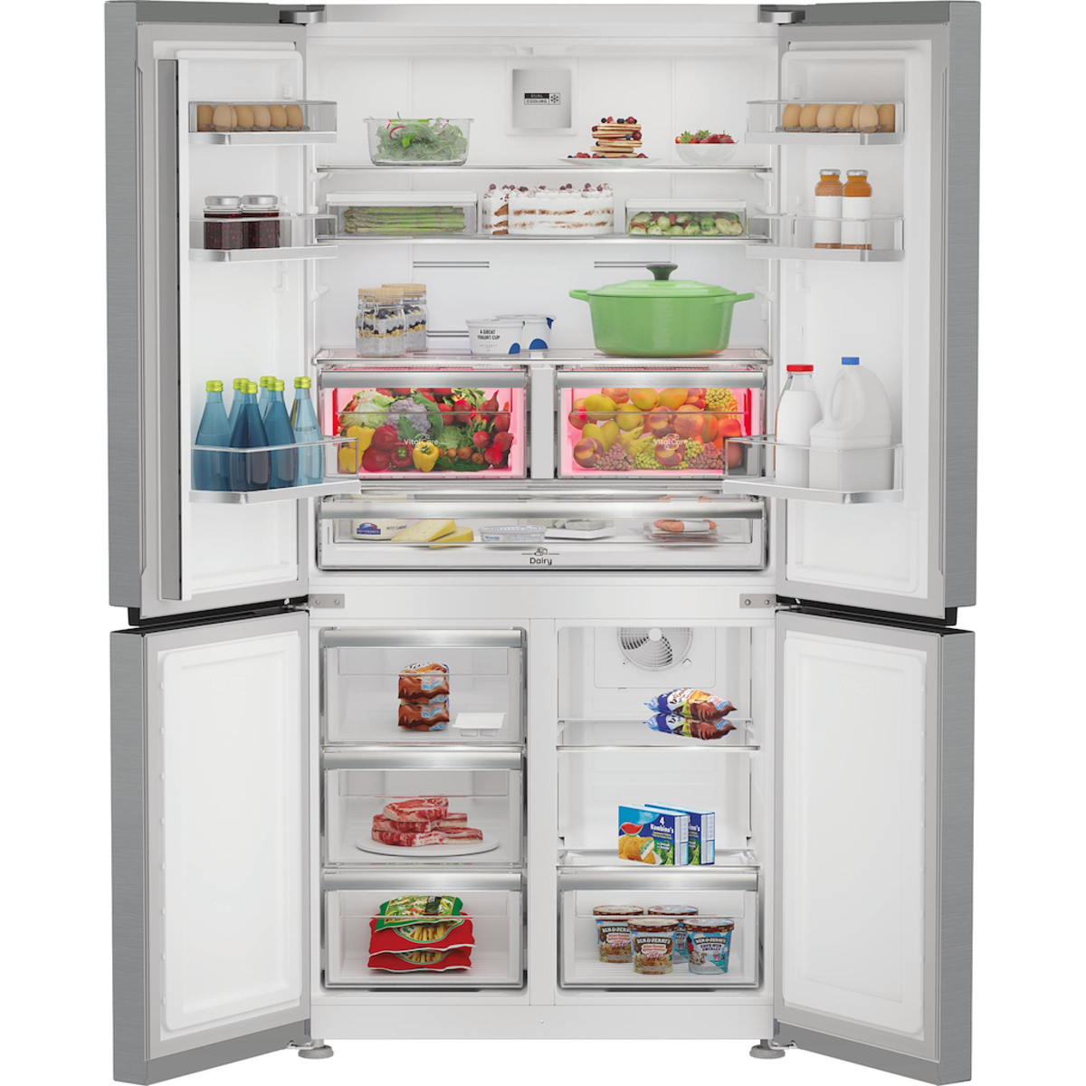 Upgrade your kitchen with this modern Hotpoint American 4-door fridge freezer, featuring a brushed steel finish and an intuitive touchscreen display for effortless control. With an extra-large 572L capacity, it has plenty of space to store around 32 shopping bags of groceries – perfect for growing families or anyone who loves to entertain. Thoughtful tech keeps your food fresh so you can reduce waste. Triple No Frost puts an end to defrosting by preventing ice and moisture building up in both the fridge and freezer sections, while the durable Inverter Compressor quickly and efficiently gets your fridge freezer back to the perfect temperature when the door is opened. In the fridge, the VitalCare drawer recreates the natural daylight cycle to help fruit and vegetables retain nutrients and antioxidants for up to a week*, and the FreshShield drawer helps keep ingredients looking and tasting their best for longer with just the right humidity**. The freezer also come with a Fast Freeze function, to quickly lock in freshness right when you need it. And with the handy Holiday Mode, you can be sure this fridge freezer will run efficiently no matter how long you're away. *Tested by Intertek for fruits and vegetables (blueberry, yellow pepper, tomato, parsley) directly exposed to the light technology compared to a refrigerator without the same technology installed (and compared to Day 0) over a 7-day period while preserved in the crisper. **According to internal tests conducted by Beko Corporate on fresh lettuce, ProFresh crisper technology can preserve freshness longer compared to standard crisper based on the K70561 cabinet.