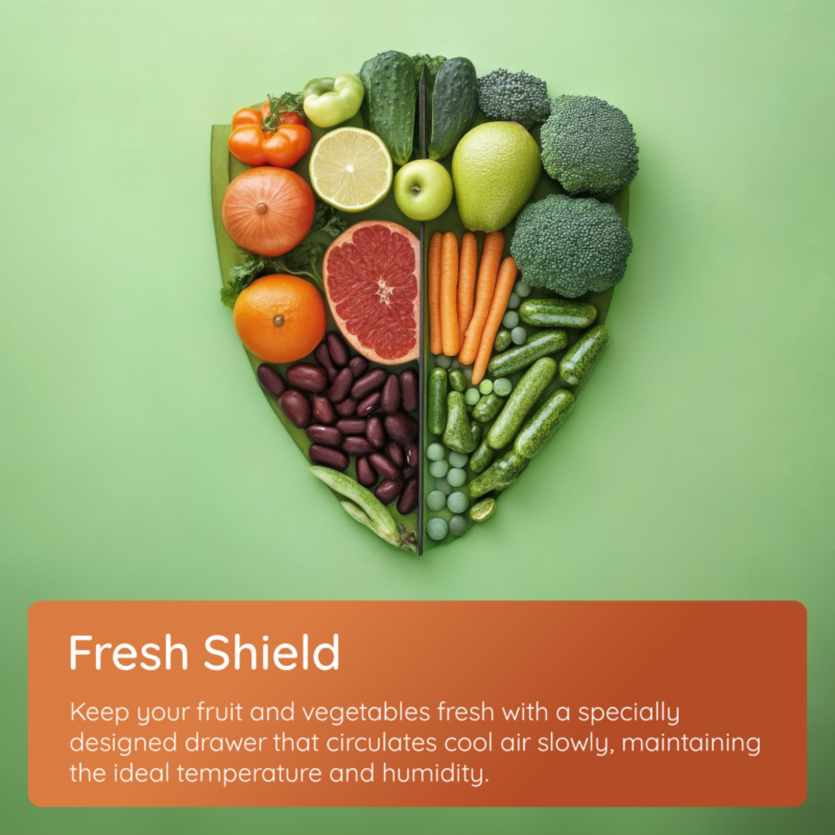 FreshShield - Keep your fruit and vegetables fresh with a specially designed drawer that circulates cool air slowly, maintaining the ideal temperature and humidity while preventing water droplets from forming. So you can enjoy nutritious meals and avoid food waste.