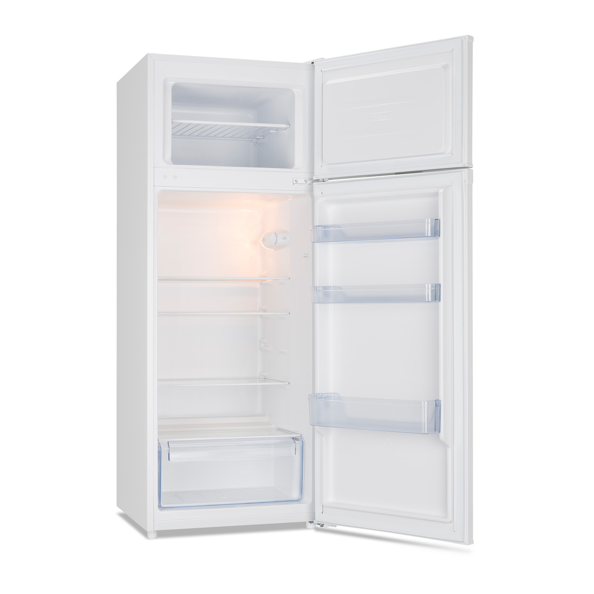 This spacious 169/37 litre top mount fridge freezer has 3 adjustable glass shelves and a salad crisper drawer to keep your fruit and veg fresh. It has balconies in the door with space for tall bottles, cartons and jars. The 4* freezer compartment provides room for well stacked frozen items.